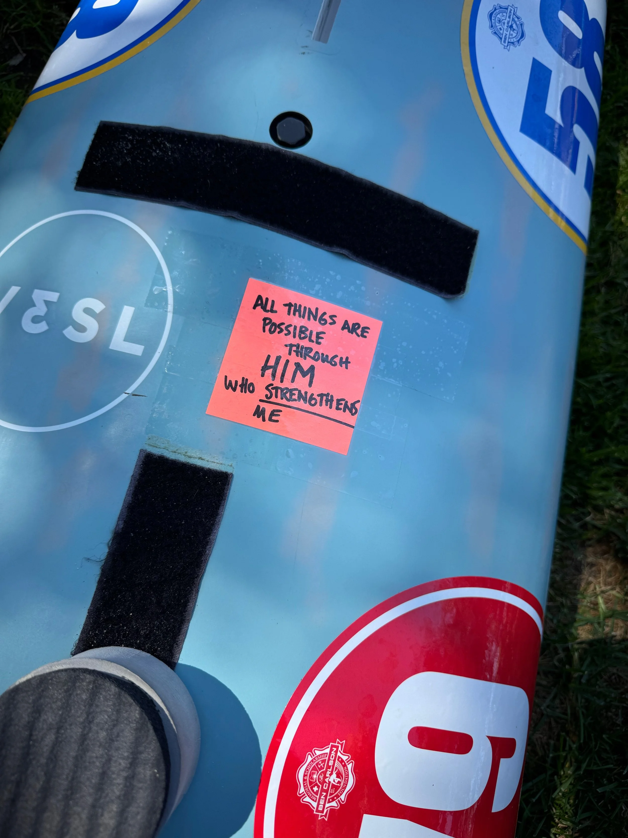 I let them know I’m going back to the car to get my things before disappearing back up the walkway. I tug on the straps to loosen the knots that hold my board to the van's roof. I’m nervous, but I try to keep a calm mind. Nothing like dropping your board just feet from the water, and just days away from the event.