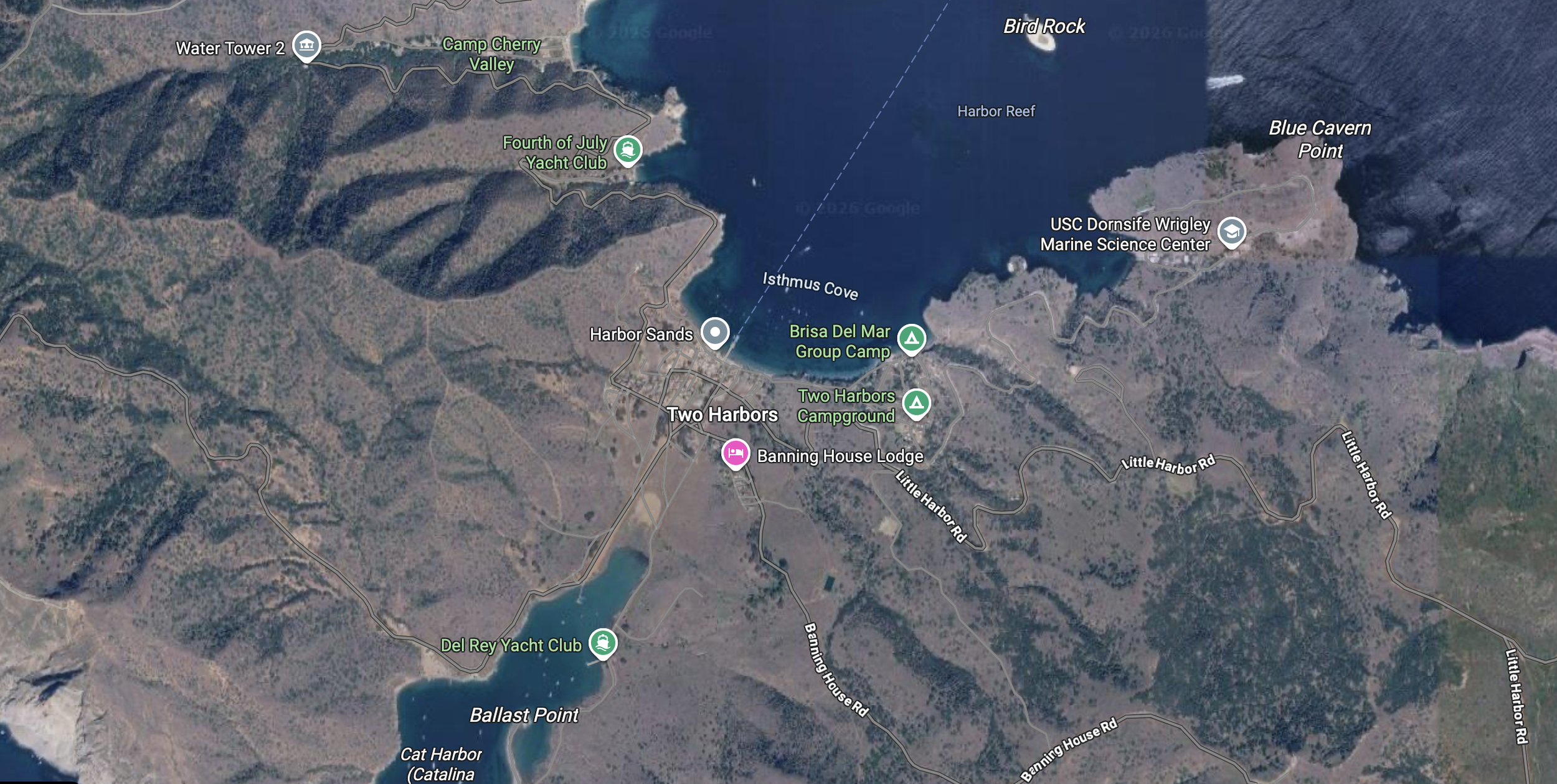After the meal, we decided to walk across the isthmus separating Two Harbors from Cat Harbor (Catalina Harbor). Red dust covers the service road, then my shoes. A little less than a mile separates the two harbors and doesn’t take long to cross.